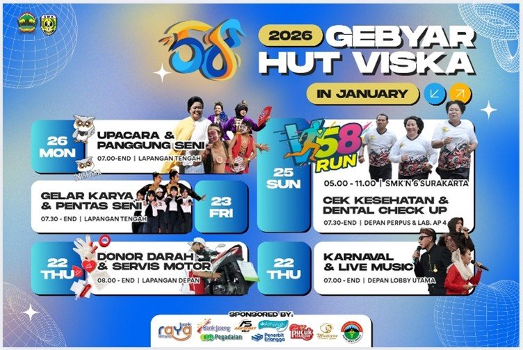 Perayaan ulang tahun SMKN 6 Surakarta telah dimulai dengan rangkaian kegiatan yang menyemarakkan hari-hari menyambut perayaan puncaknya. Setelah persiapan panjang yang dilakukan di berbagai lini dengan kegiatan maka mulai Kamis, 22 Januari 2026 diadakan: Karnaval, Servis motor Honda, Donor darah, live music oleh bapak ibu guru dan karyawan, serta bazar jajanan.